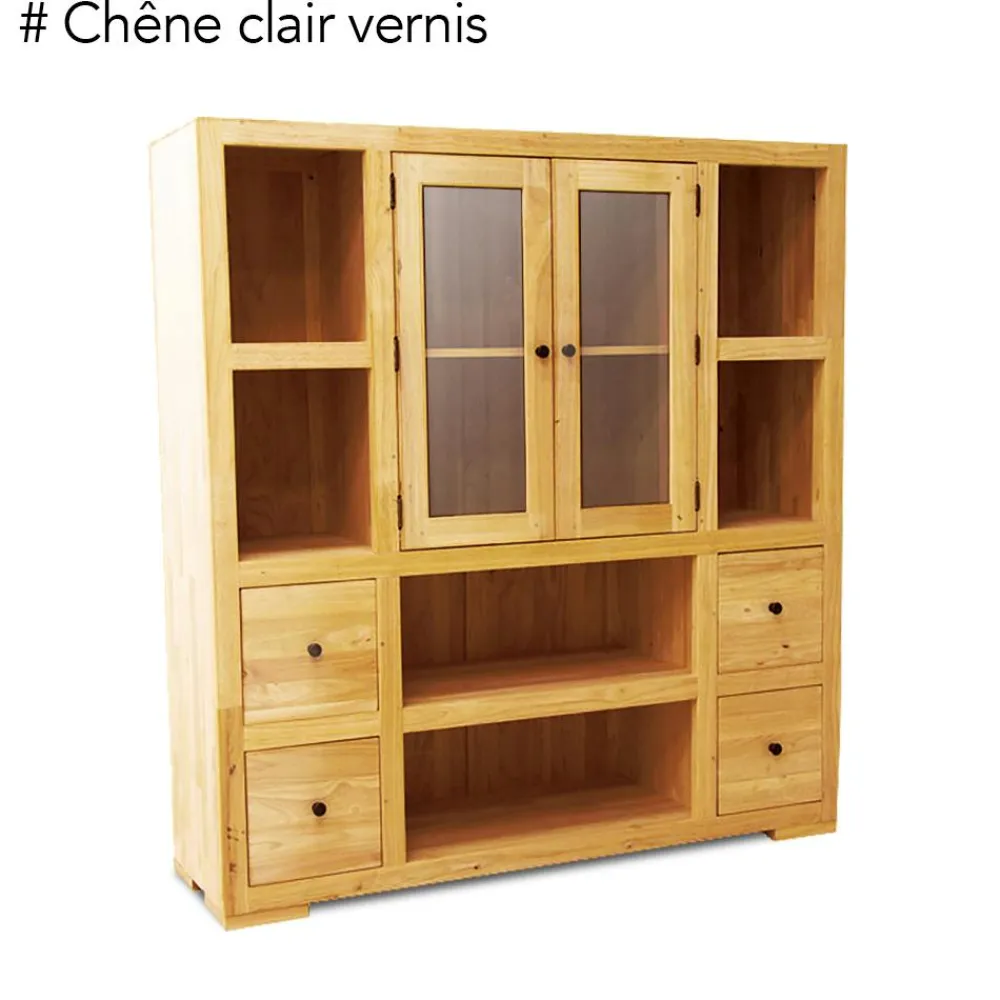 Bibliothèques En Bois|Bibliothèques En Bois|Olga Bibliothèque / Vaisselier Hévéa 2 portes vitrées et bois, 2 tiroirs, 6 niches 130x40x140cm