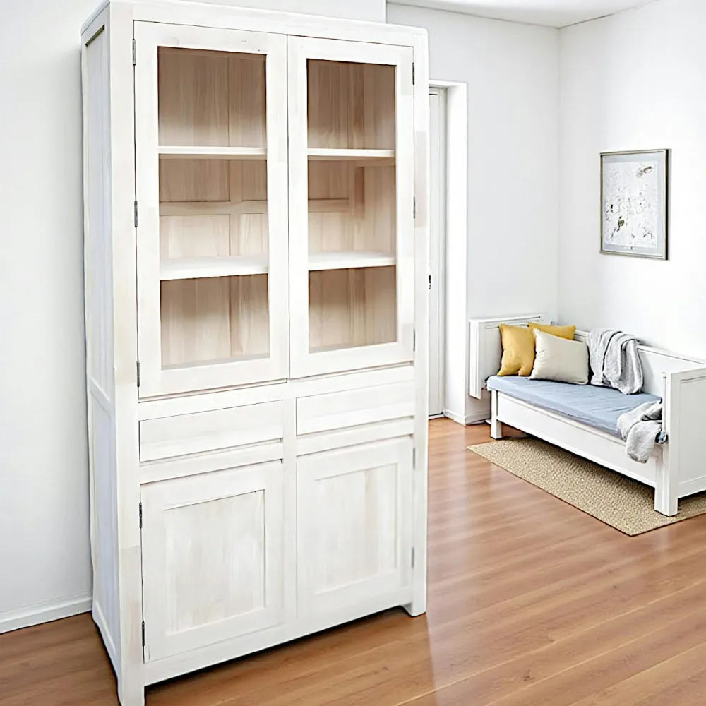 Buffets Contemporains|Buffets Contemporains|Olga Vaisselier Hévéa 4 portes dont 2 vitrées, 2 tiroirs 100x40x190cm
