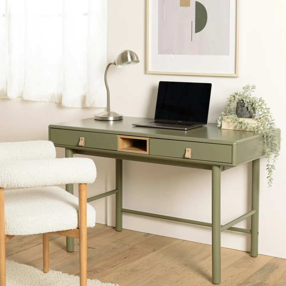Bureaux En Bois|GUILIN Bureau 2 tiroirs bois vert nature