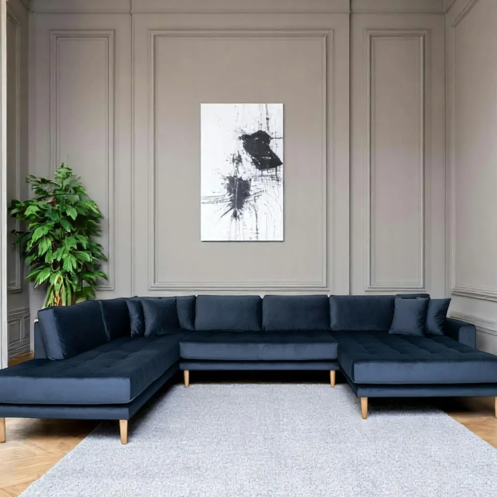 | Informations particulières : | 4 coussins décoratifs inclus. Pieds en bois noir. Hauteur d’assise 41 cm, Profondeur d’assise 84 cm, et 163 et 210 cm sur les longueurs d’assise. |