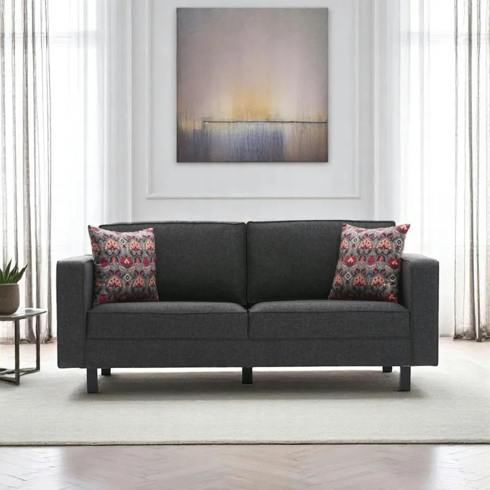| Informations particulières : | 2 coussins décoratifs (garniture fibres) inclus. Hauteur du dossier : 43 cm ; profondeur d’assise : 60 cm ; hauteur d’assise : 40 cm ; épaisseur des accoudoirs : 14 cm ; hauteur des pieds : 13 cm. |