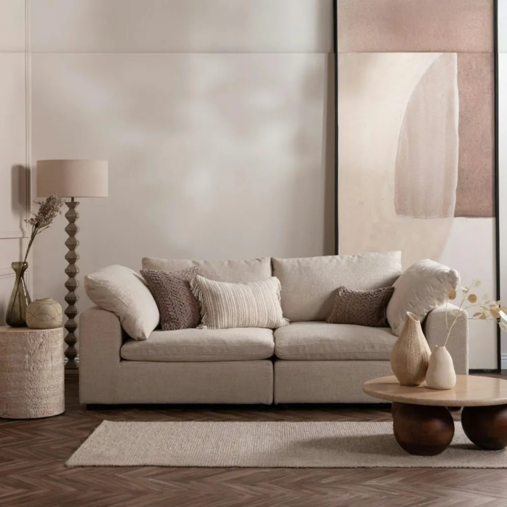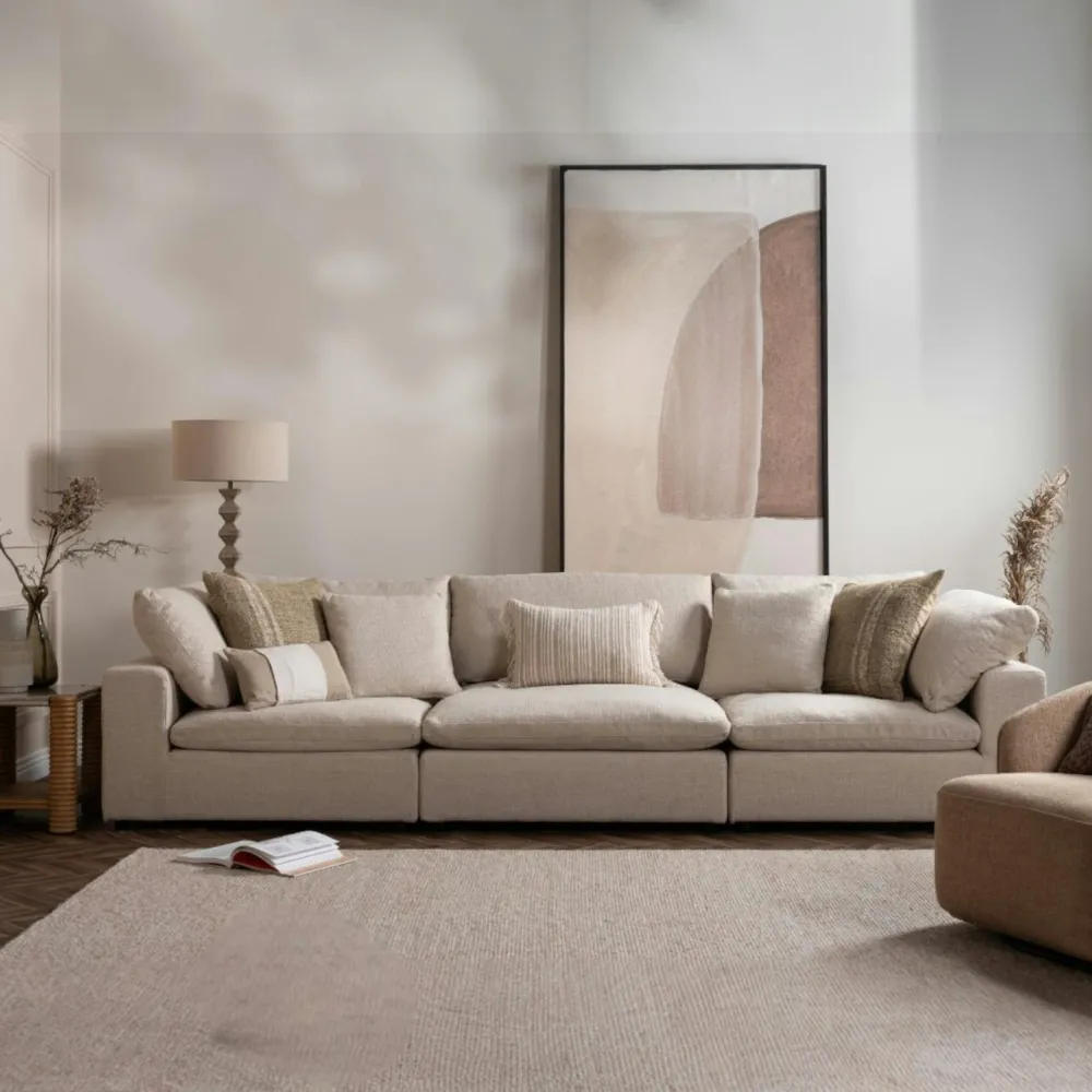 | Informations particulières : | Canapé constitué de 5 éléments. Structure : cadre en bois de pin massif. Panneaux et assise : panneaux en contreplaqué avec coussins garnis de plumes. Coussins de dossier : Mélange de plumes et de fibres polyester. Pieds : pieds en plastique noir. Canapé vendu sans les coussins décoratifs. |