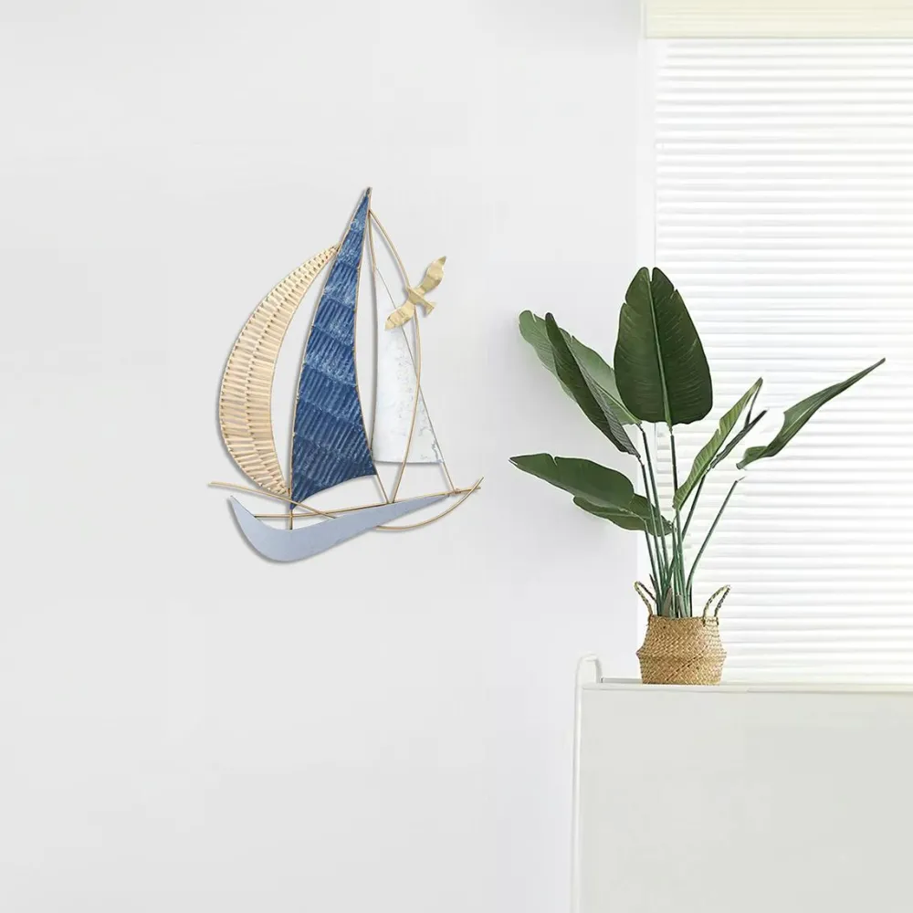 Décorations Murales| Décoration murale voilier bleu métal et rotin