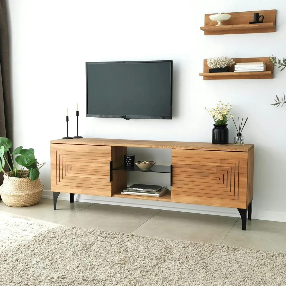 Meubles Tv En Bois|LECCE Meuble TV bois clair sculpté – 2 étagères assorties