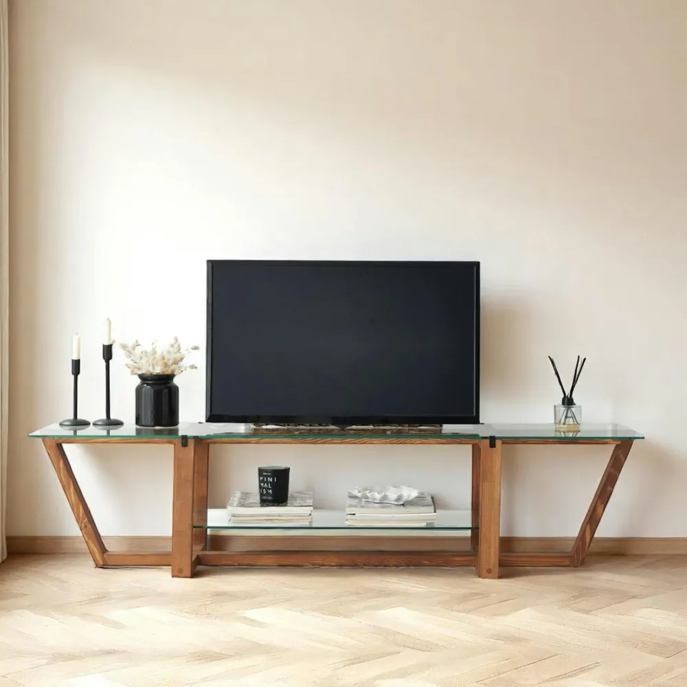 Meubles Tv En Bois|LHASA Meuble TV verre trempé bois foncé – 158 cm 2 niveaux