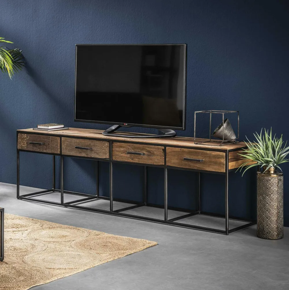Meubles Tv En Bois|WELLINGTON Meuble tv bois recyclé brut acier 4 tiroirs