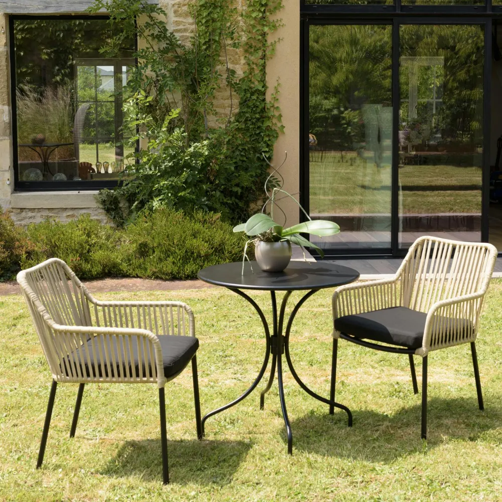 Salons De Jardin·Ensemble Repas|GIJON Salon de jardin 1 table ronde métal noir D70 cm – 2 fauteuils cordage couleur naturelle 1 coussin noir