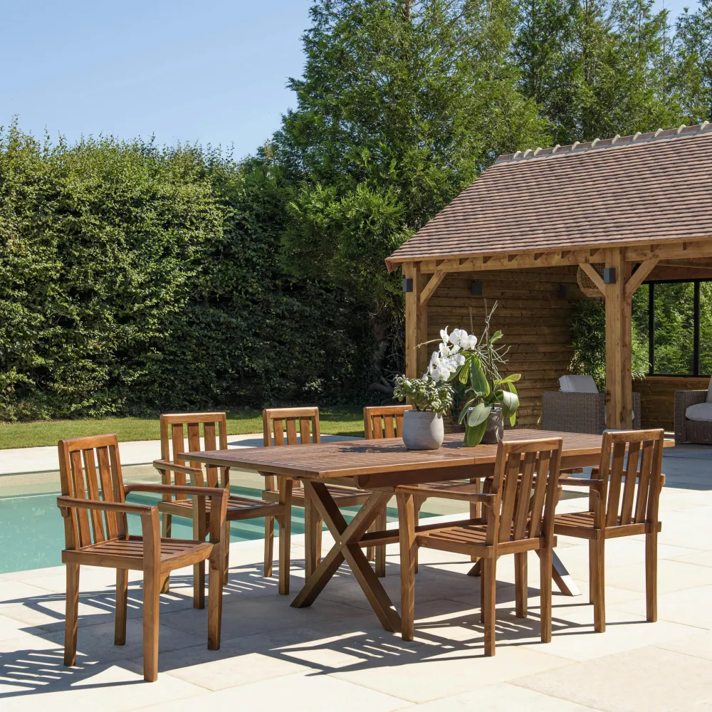 Salons De Jardin·Ensemble Repas|MACAO Salon de jardin teck huilé table pieds en croix 180/240 + 6 fauteuils