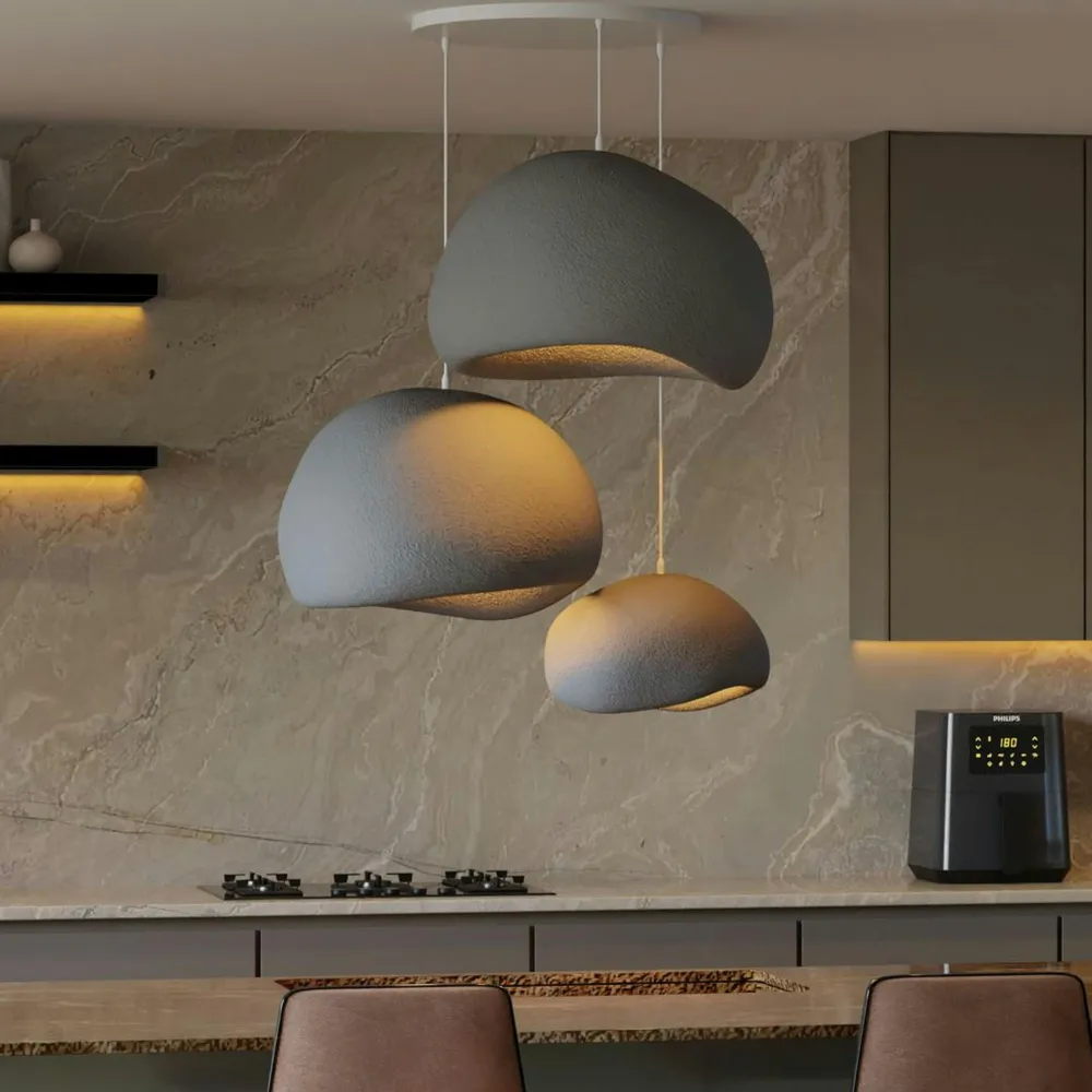 | Informations particulières : | Cette suspension design au style organique s’inspire de l’esthétique japonaise wabi-sabi. Avec ses abat-jour asymétriques, elle allie modernité et minimalisme naturel pour sublimer votre intérieur. Dimensions du petit abat-jour : 34 cm de large, 28 cm de profondeur, et 19 cm de hauteur ; et des deux grands abat-jour : 42 cm de large, 38 cm de profondeur, 28 cm de hauteur. 3 ampoules E27 max 40W, non fournies. Protection IP20. Câble réglable en hauteur entre 68 cm et 120 cm. |