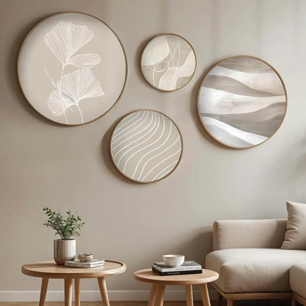 Tableaux / Toiles| Tableau rond zen beige et bois – nature abstraite (set de 4)