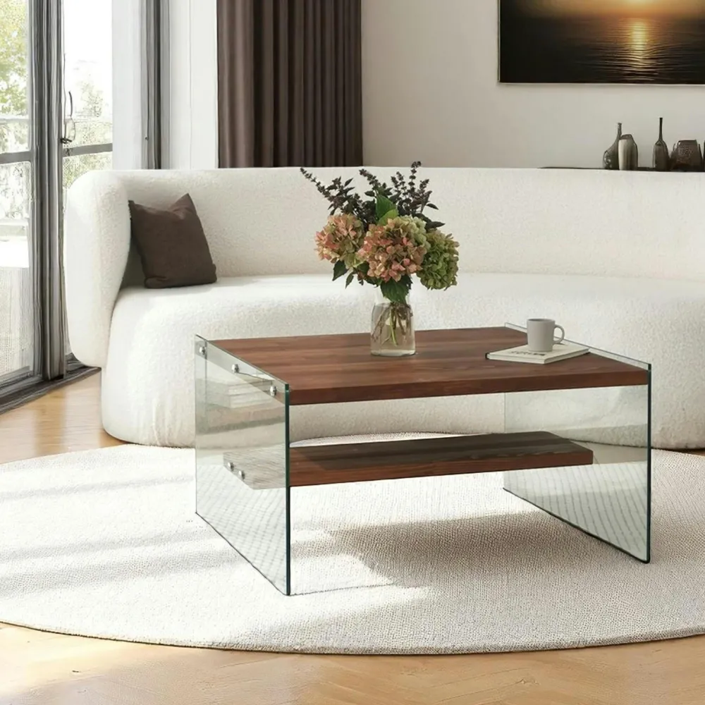 Tables Basses En Verre|Tables Basses Carrées|LHASA Table basse verre et bois – plateaux marrons suspendus