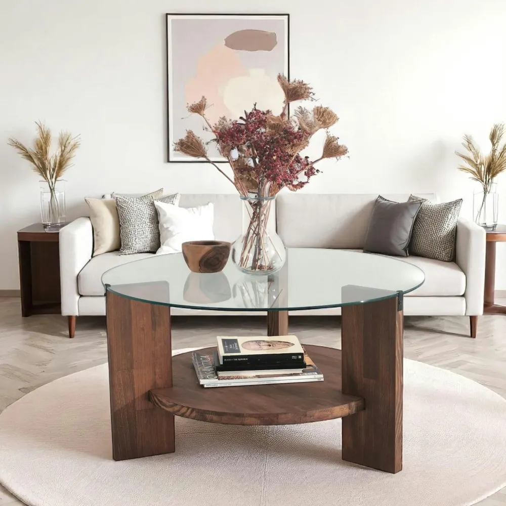 Tables Basses En Verre|Tables Basses Rondes|ANZIO Table basse ronde en verre et bois clair – 2 plateaux