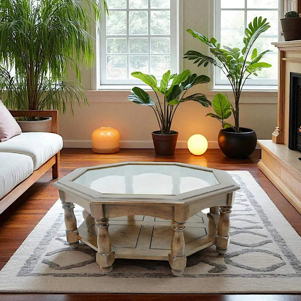Tables Basses Rondes|Tradition Table basse Octogonale Hévéa double plateaux, 1 plateau haut verre, 1 plateau bas bois D100xH40cm