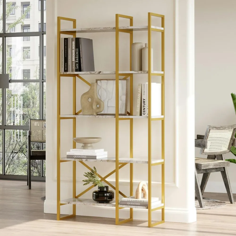 Bibliothèques En Métal|Bibliothèques En Métal|JENA Bibliothèque salon chic effet marbre blanc et métal doré
