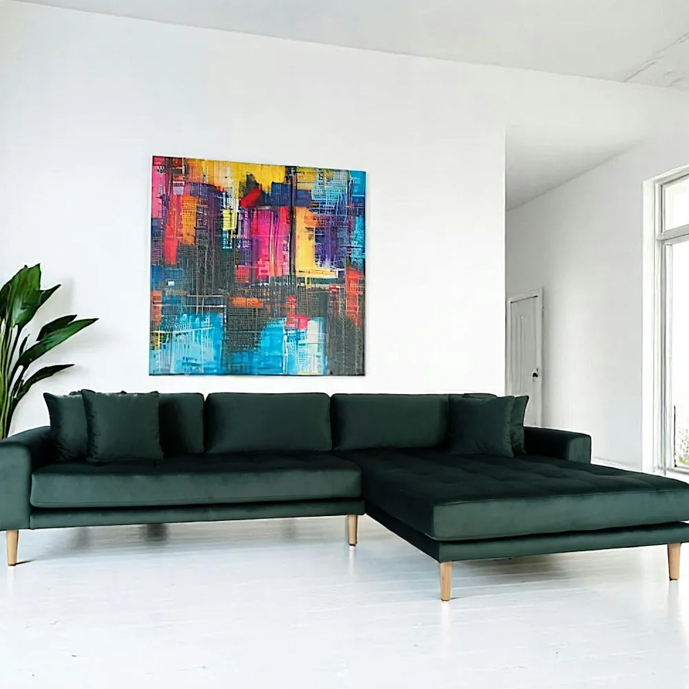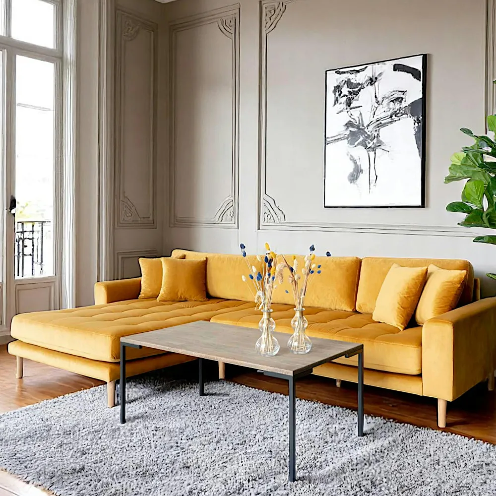 | Informations particulières : | Assise capitonnée. Méridienne sur la partie droite pour s’étendre. 4 coussins décoratifs décoratifs inclus. Pieds en bois blond. Hauteur d’assise 43 cm, Profondeur d’assise 64 cm et 142 cm au niveau de la méridienne. |