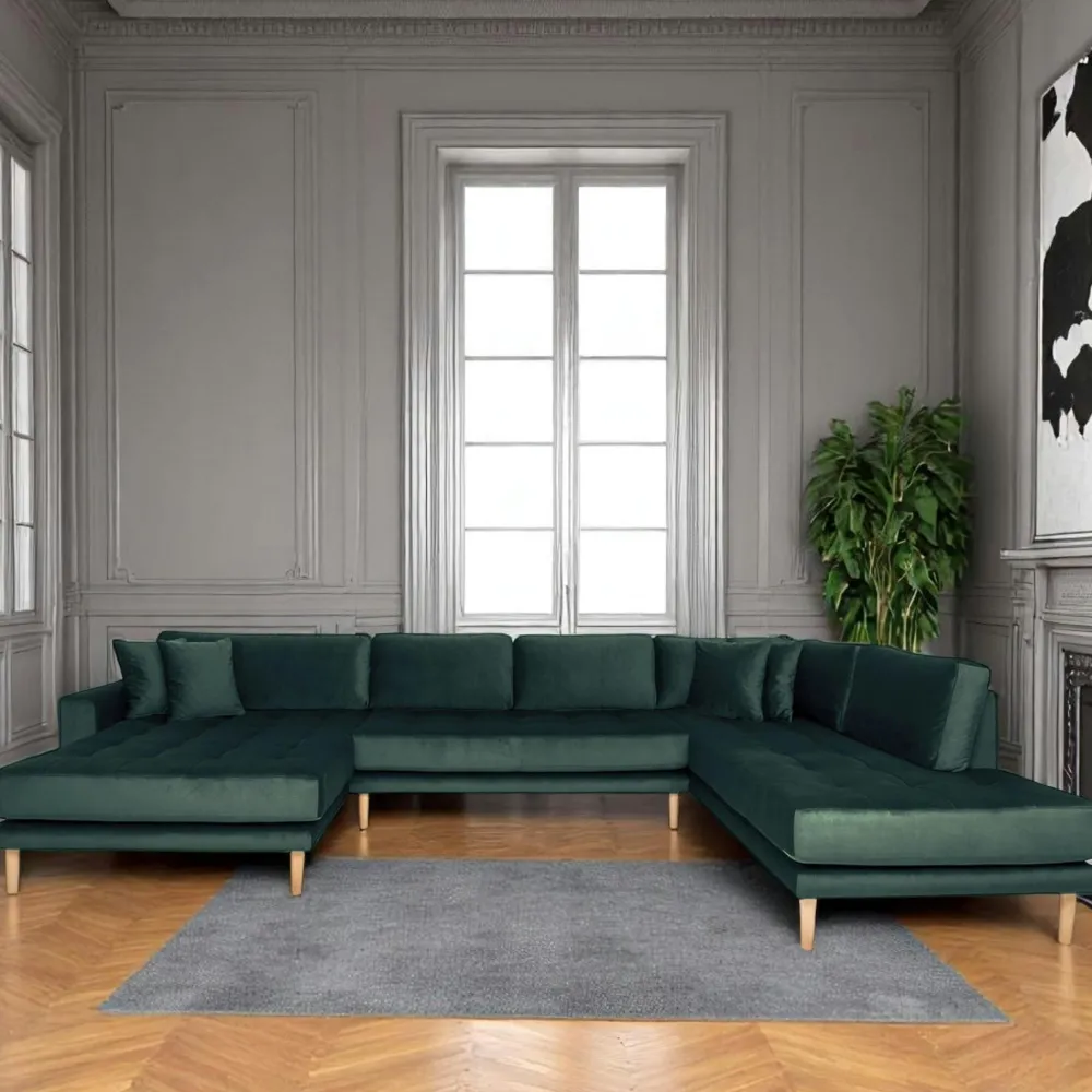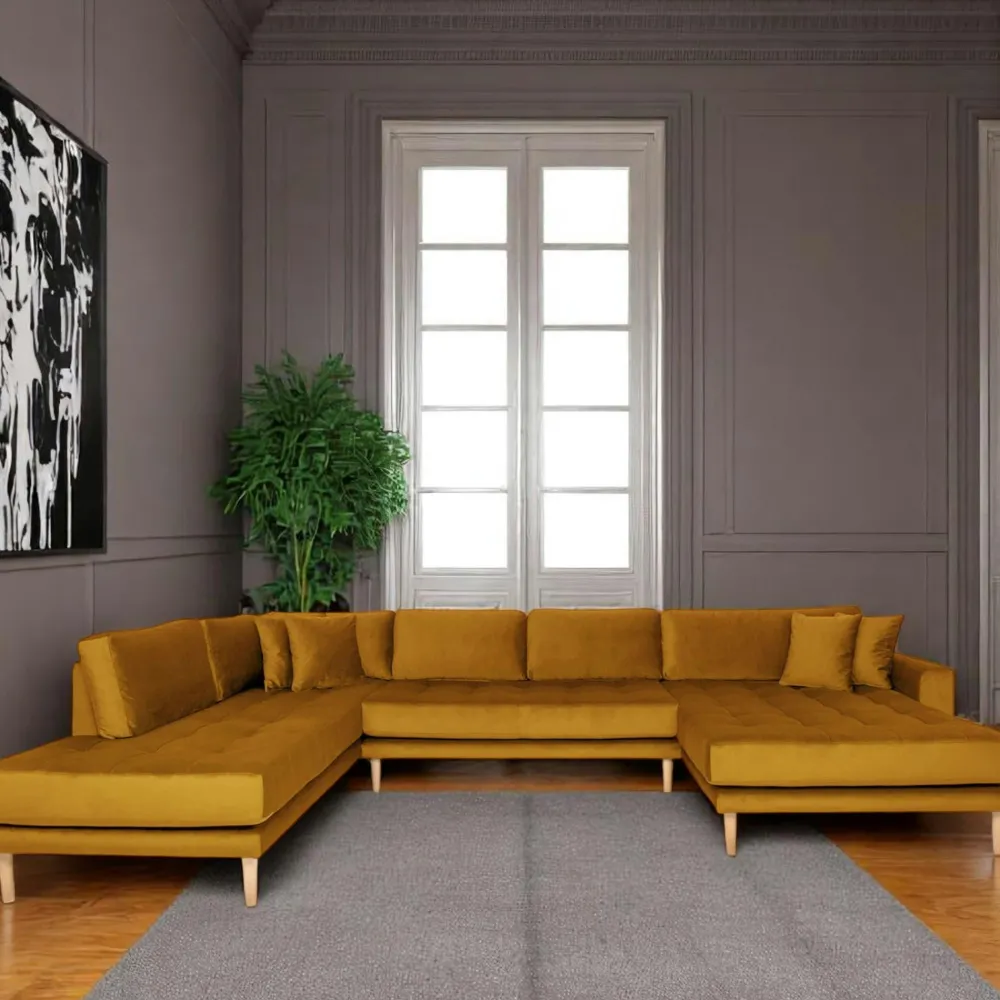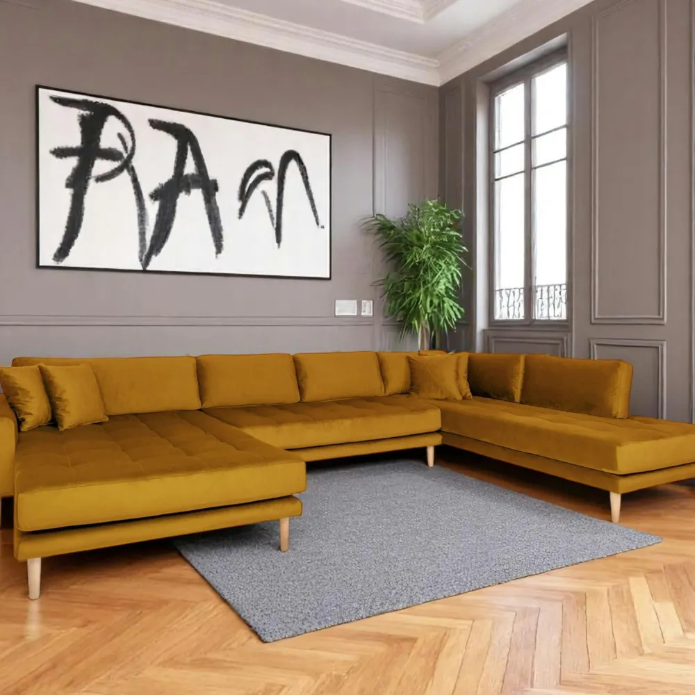 | Informations particulières : | Tissu velours. 4 coussins décoratifs inclus. Pieds en bois blond. Hauteur d’assise 41 cm, Profondeur d’assise 84 cm, et 163 et 210 cm sur les longueurs d’assise. |
