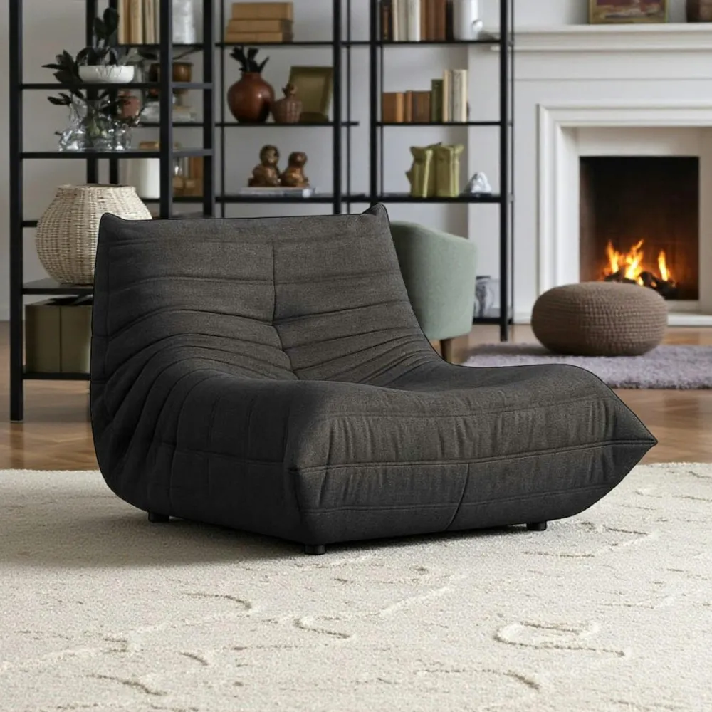 | Composition : | Tissu 100% polyester. Structure sans cadre avec soutien en panneau de particules. Densité de la mousse 28 kg au m3. Pieds en plastique noir. |