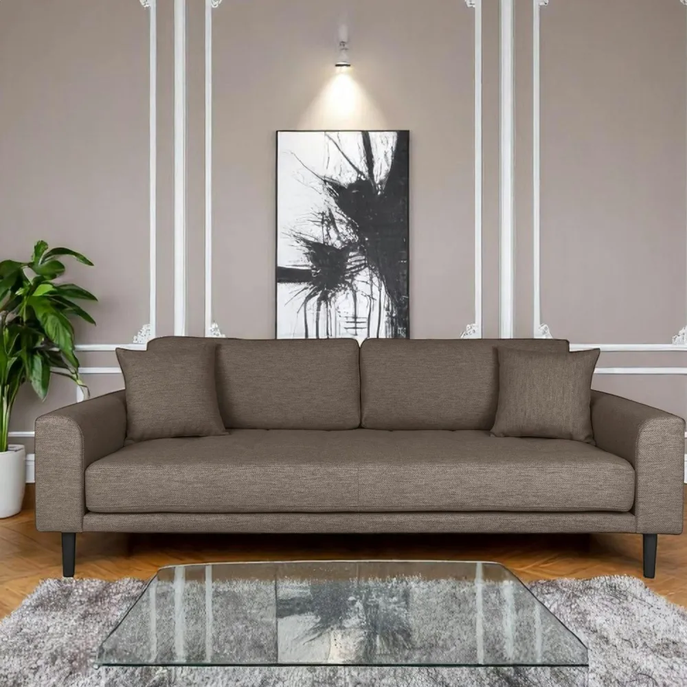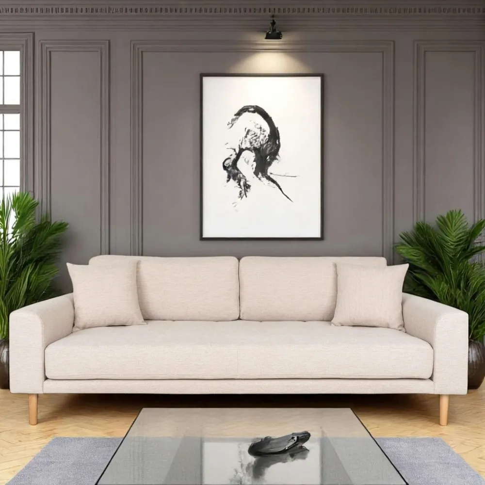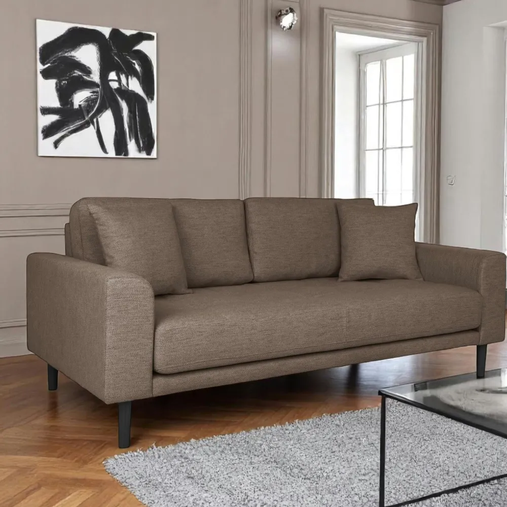 | Informations particulières : | 2 coussins décoratifs inclus. Pieds en bois blond. Hauteur d’assise 40 cm, Profondeur d’assise 65 cm. |