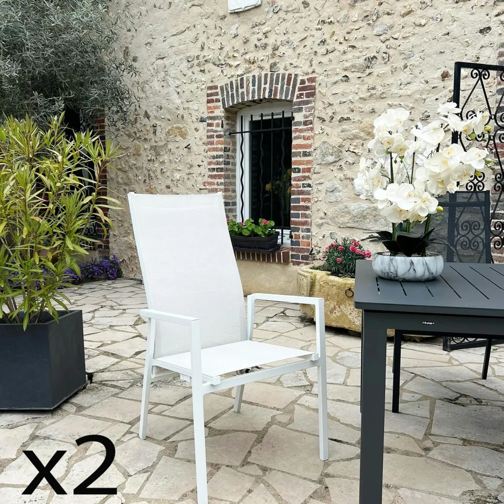 | Informations particulières : | Modèle empilable. Dossier inclinable. Structure en aluminium pour rester en extérieur toute l’année. Assise en textilène (résiste aux UV et à l’eau). Hauteur d’assise : 42 cm. |