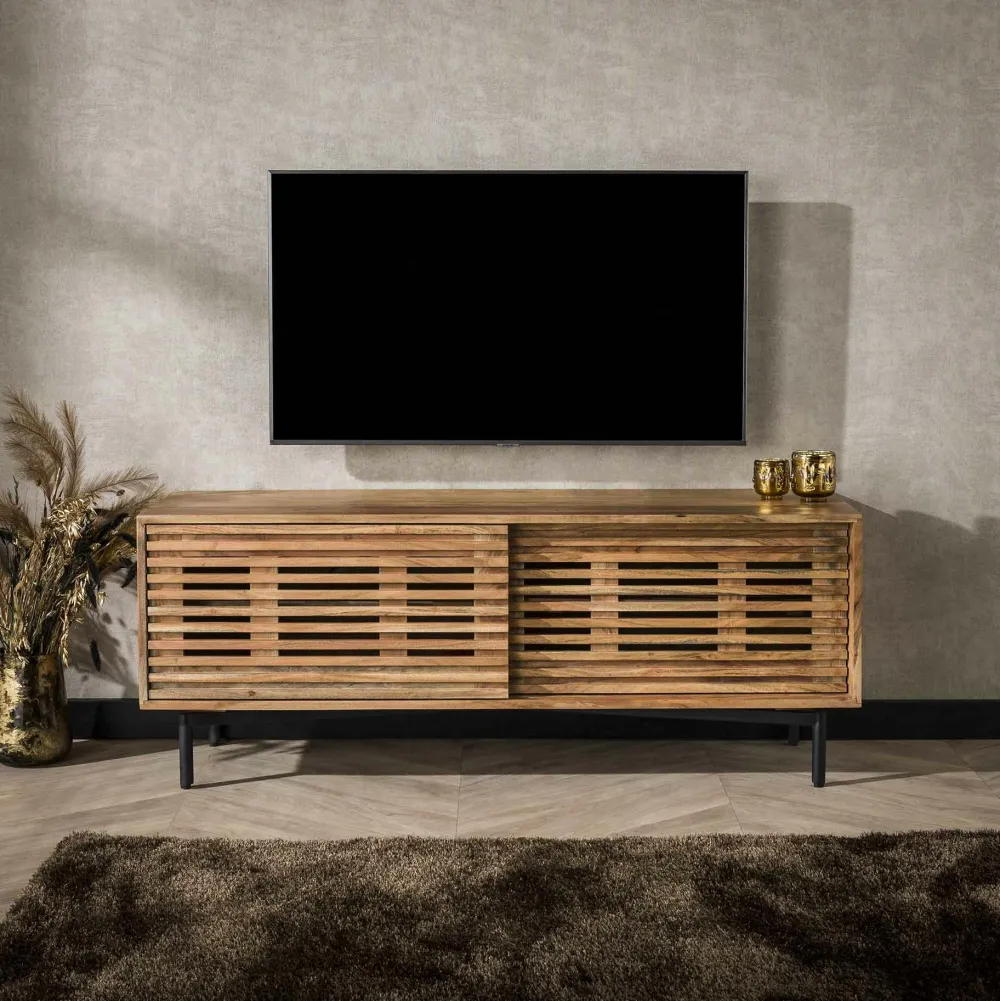 Meubles Tv En Bois|New Orléans Meuble TV Hévéa 3 portes coulissantes Persiennes 180 cm NEW ORLEANS