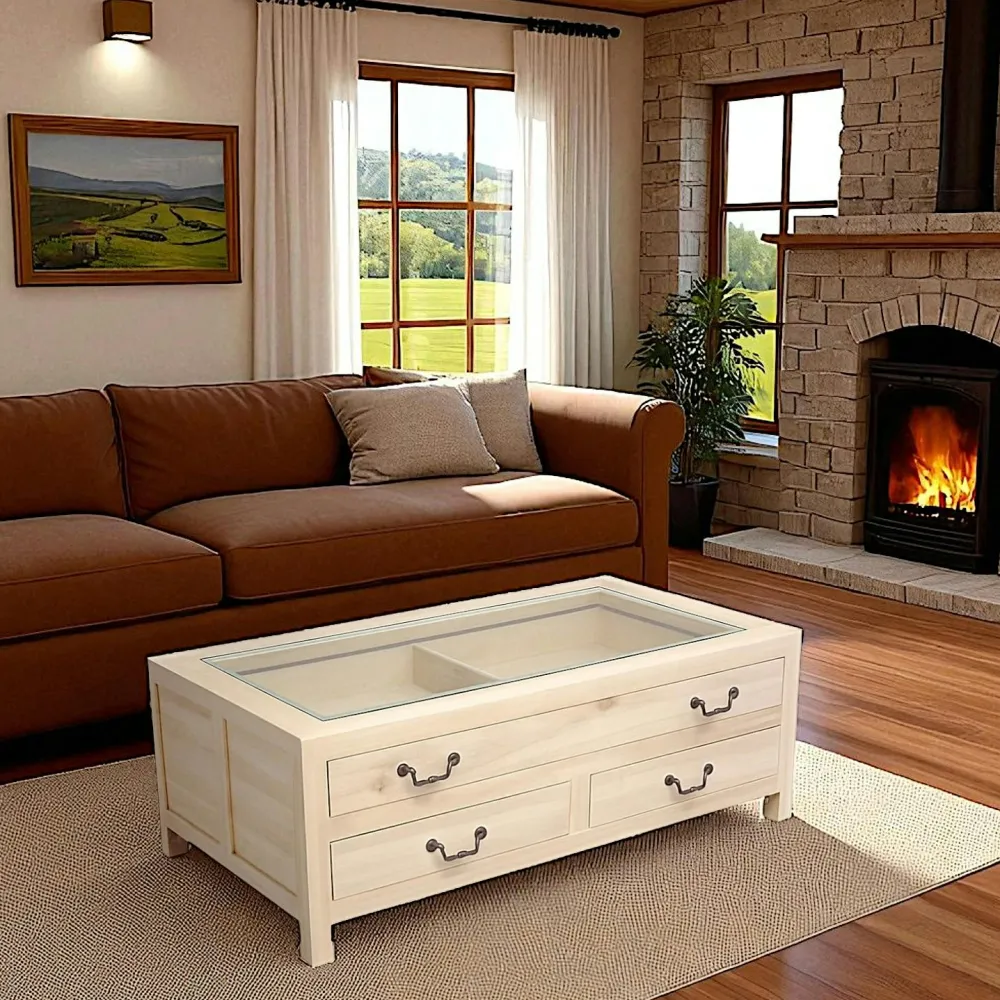 Tables Basses À Tiroirs|Maori Table basse vitrée Hévéa 3 tiroirs 120x65x40cm