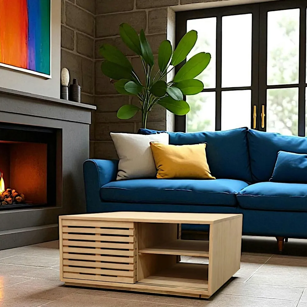 Tables Basses Carrées|New Orléans Table basse Hévéa 4 portes coulissantes Persiennes 100x100x45cm NEW ORLEANS