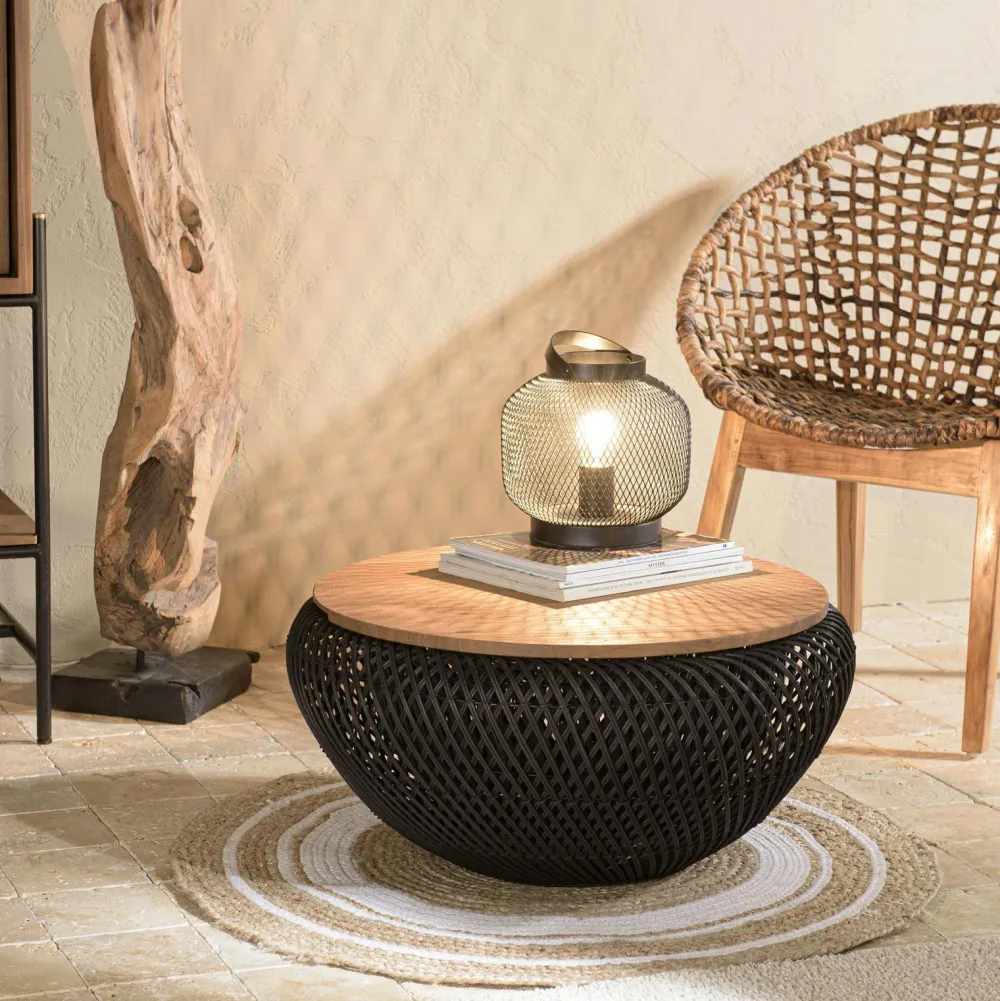 Tables Basses Rondes|Swing Table basse coffre ronde rotin noir et teck recyclé 66 cm